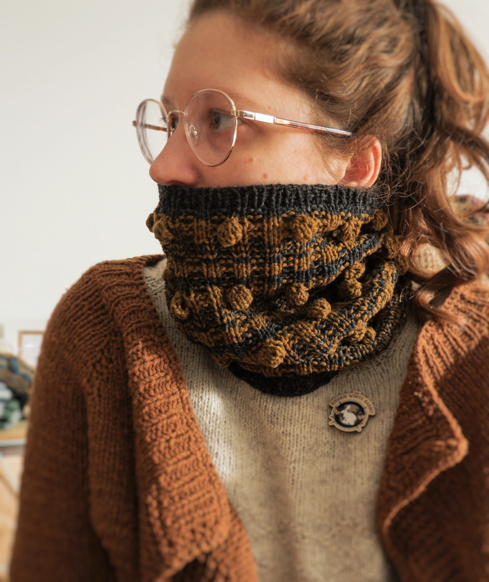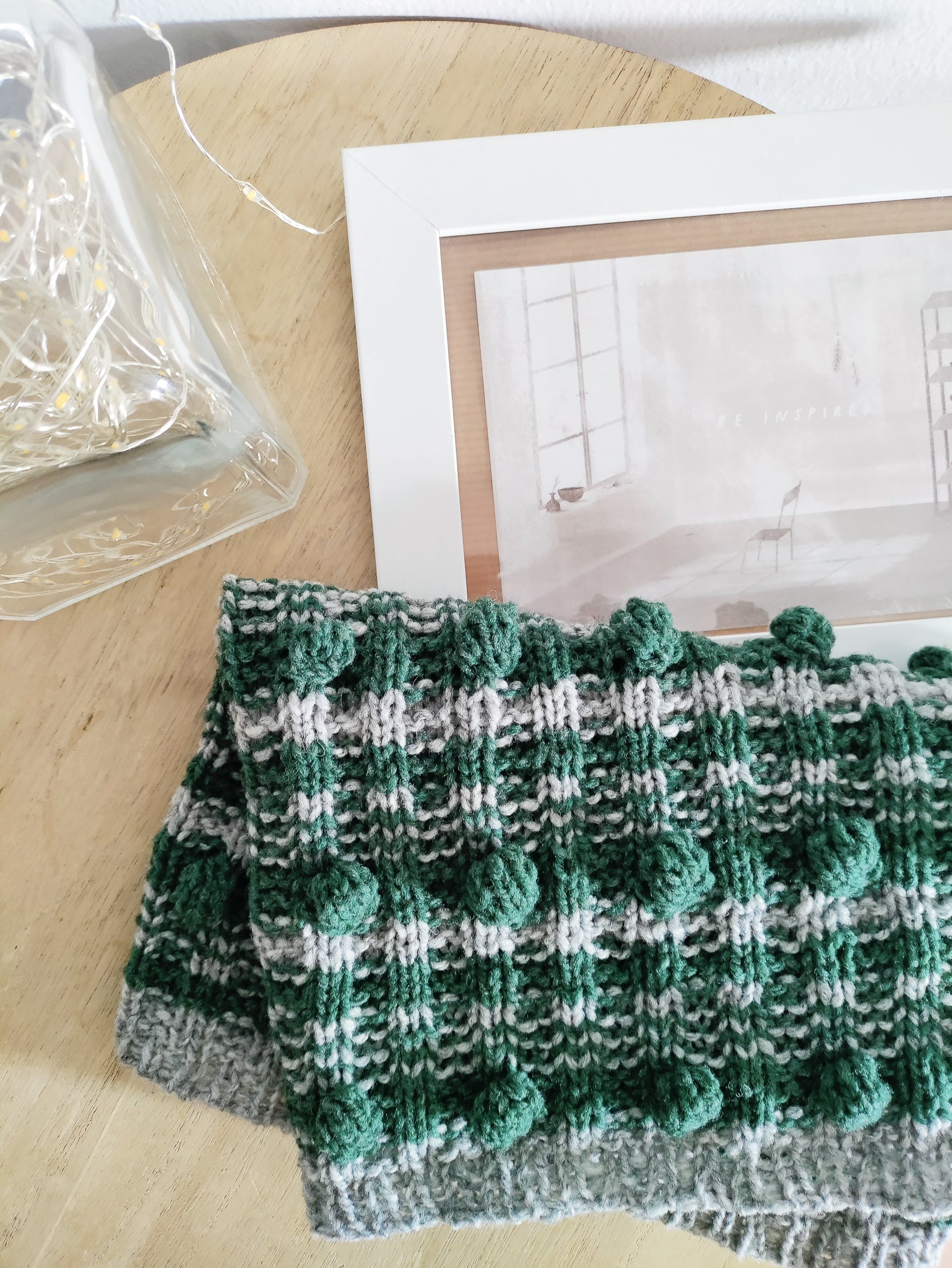 Il Collo Bolle è uno scaldacollo realizzato con morbida lana merinos ecologica. Ha una fantasia a righe e decorazioni a bolla.