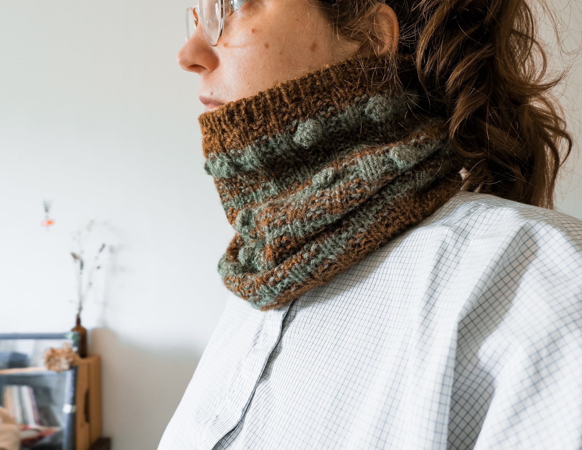 Il collo Jondini è lavorato in tondo e ripete un motivo realizzato con semplici punti di dritto e rovescio e con alcuni divertenti pompon.
