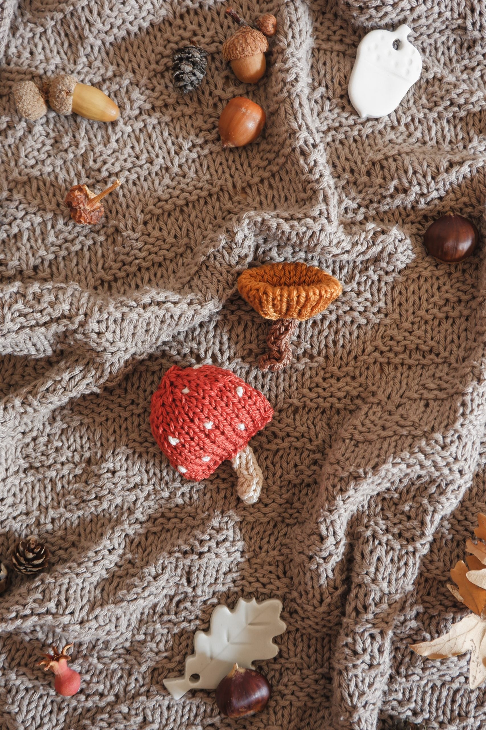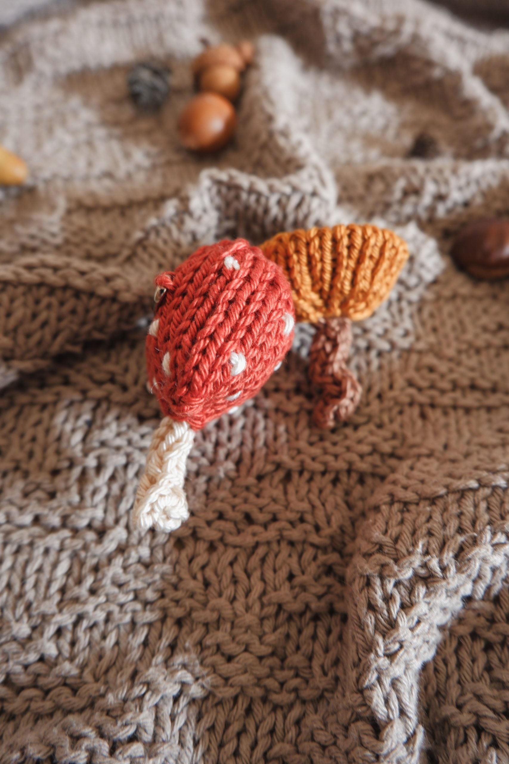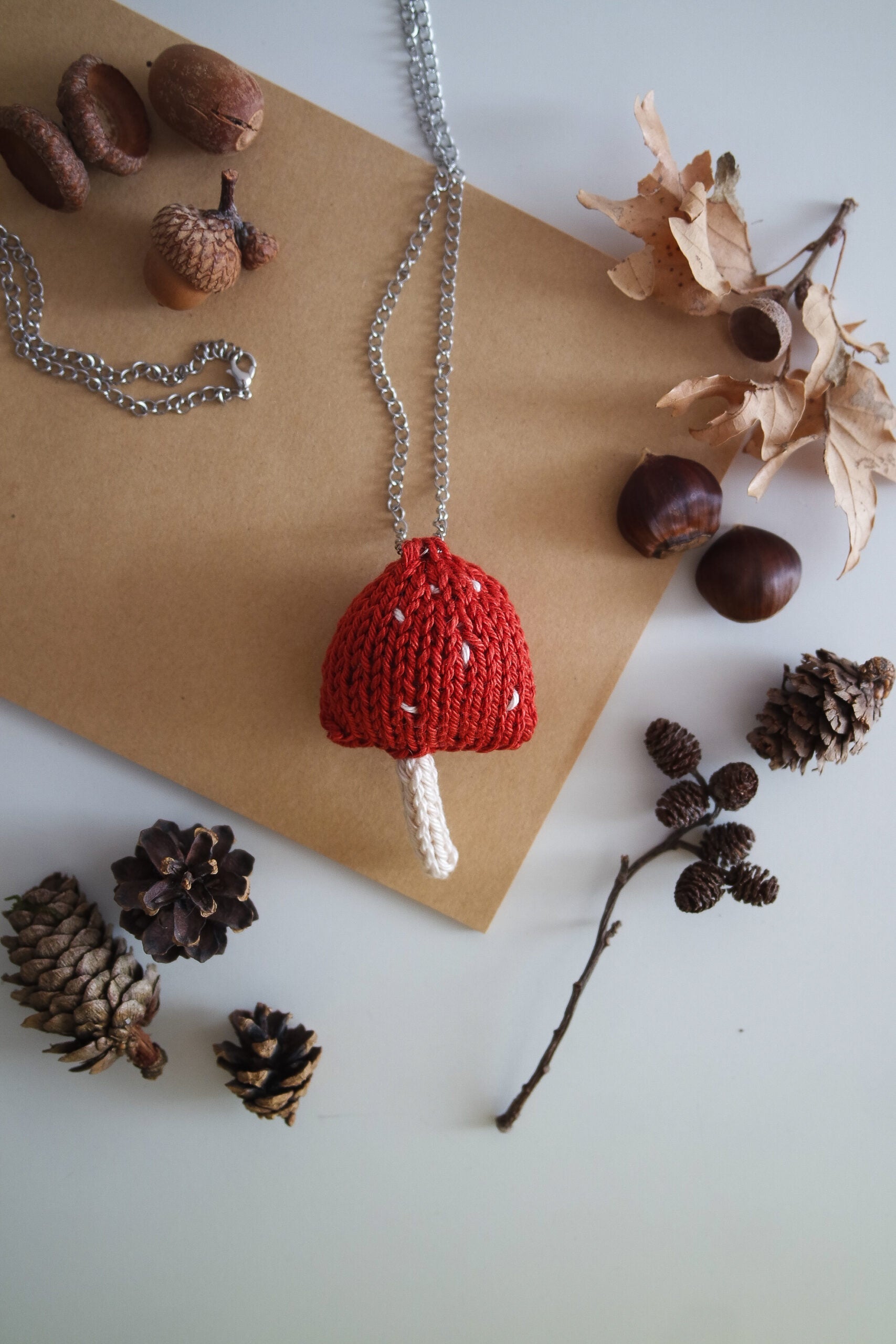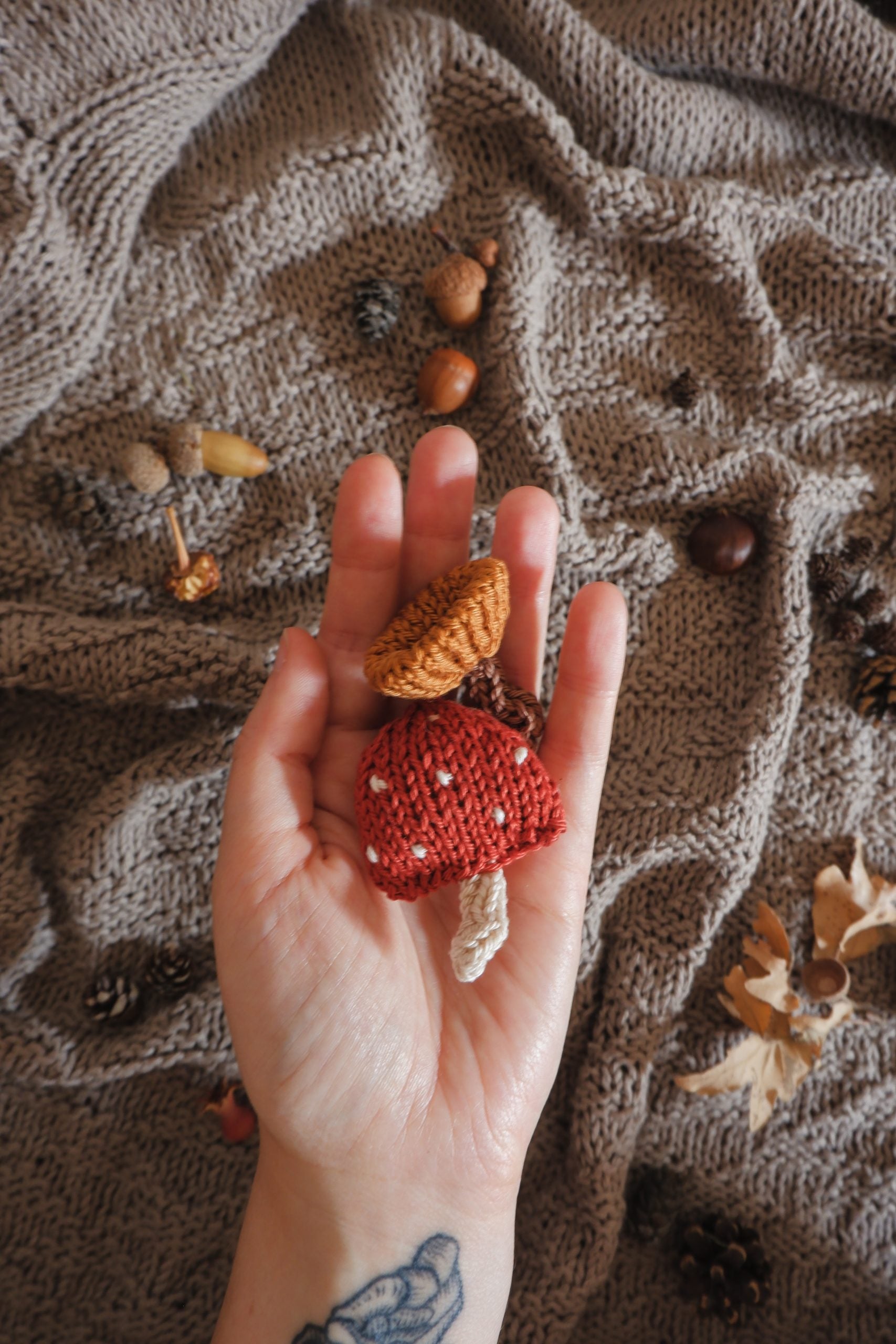 Spilla a forma di fungo velenoso realizzate a maglia. Queste spille sono perfette da essere attaccate a maglie, giacche e cappotti, per esempio.