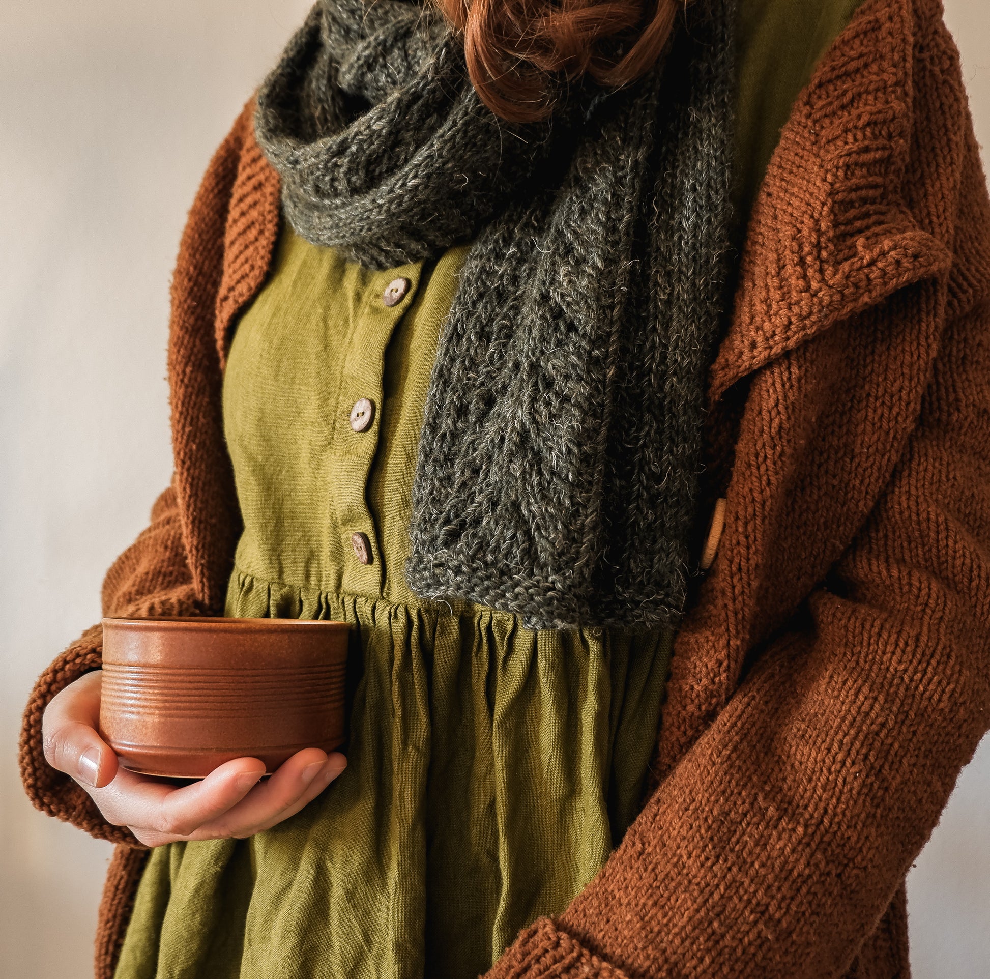 Filato- Versione invernale: 2 gomitoli da 200 g di Flax Down (light worsted/dk weight) di Purl Soho (nel campione ho usato il colore Juniper Green), 43% baby alpaca, 42% merino extra fine, 15% lino; 100 g, 200 m