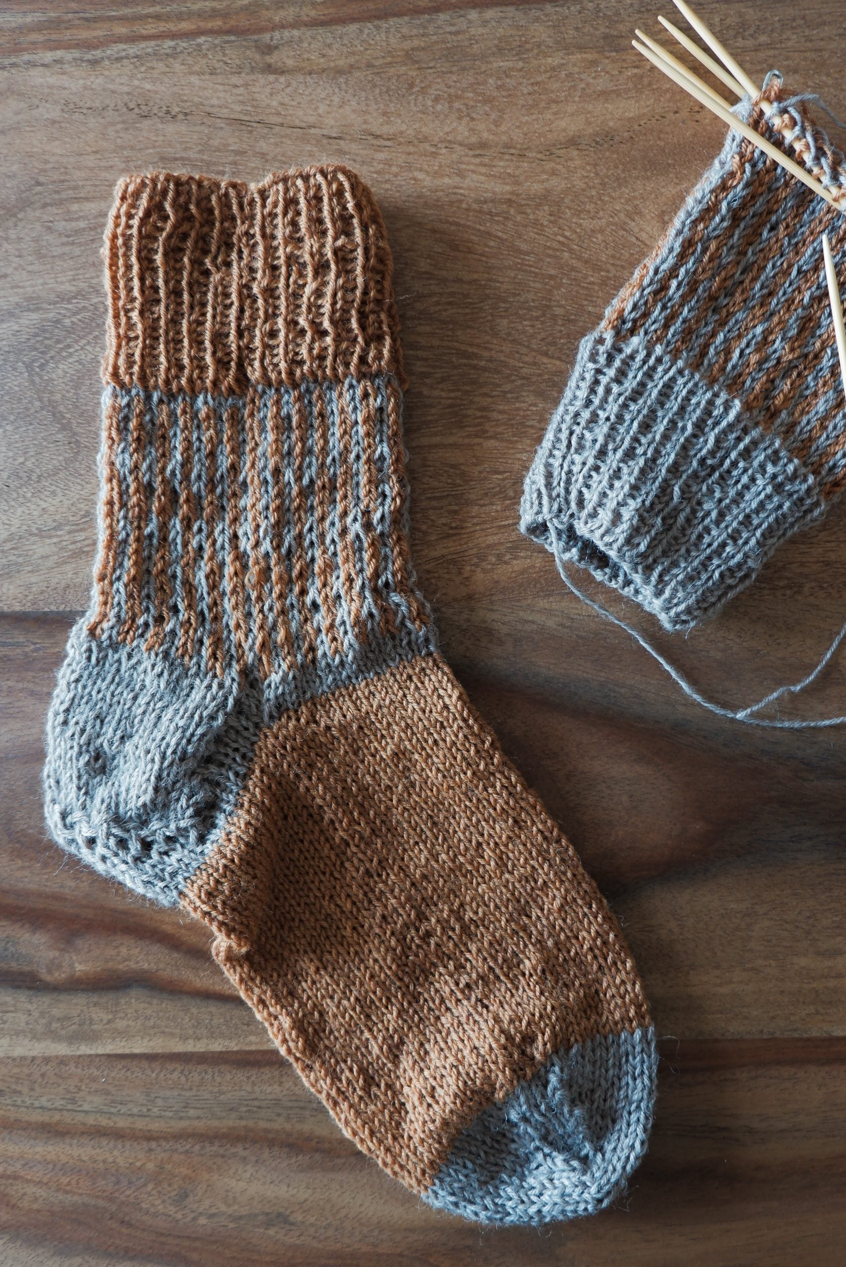 Filato Filato per calze Lang Jawoll, 2 gomitoli. Ho usato i colori A 339 e B 45. Ferri Ferri a doppia punta da 2,5 mm (UK 13/ US 1,5) (le istruzioni sono per utilizzare il gioco di ferri, ma puoi utilizzare anche i ferri circolari, solo tiene presente che cambieranno un po' le istruzioni) Altri materiali Ago per filato↟ Campione