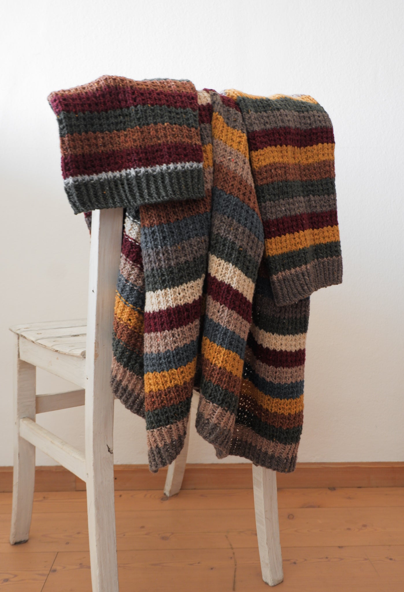 Cardigan a righe lungo, aperto sul davanti, senza bottoni, ma chiudibile con una spilla. Il cardigan è realizzato a mano usando una morbida lana bio dal sapore nord europeo e dall'effetto tweed.