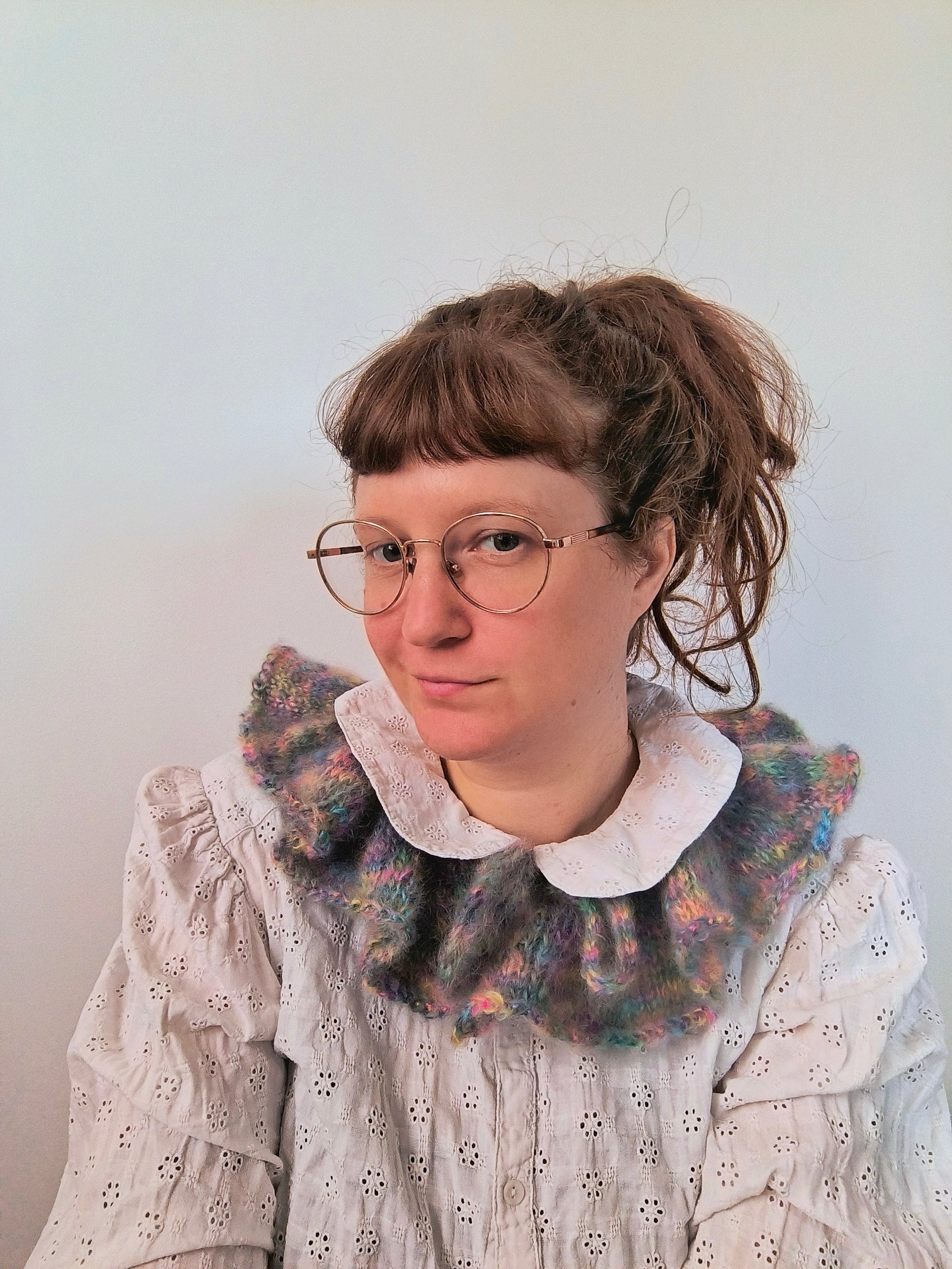 Materiale: utilizzo filati di campionario o avanzi di filato da altri progetti, per cui i miei colletti sono tutti pezzi unici. I filati variano sempre, ma utilizzo sempre filati che abbiano nella composizione del mohair.