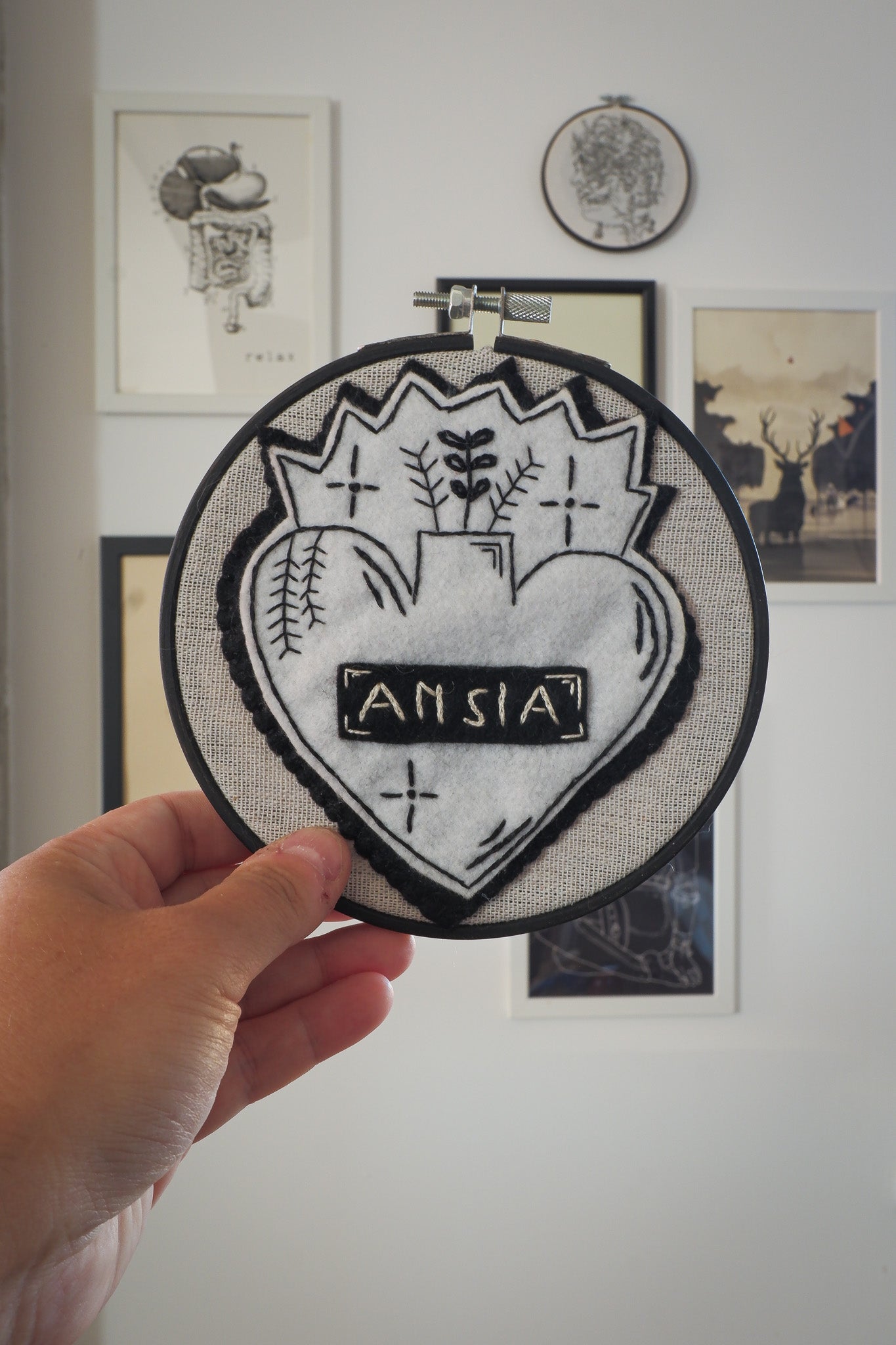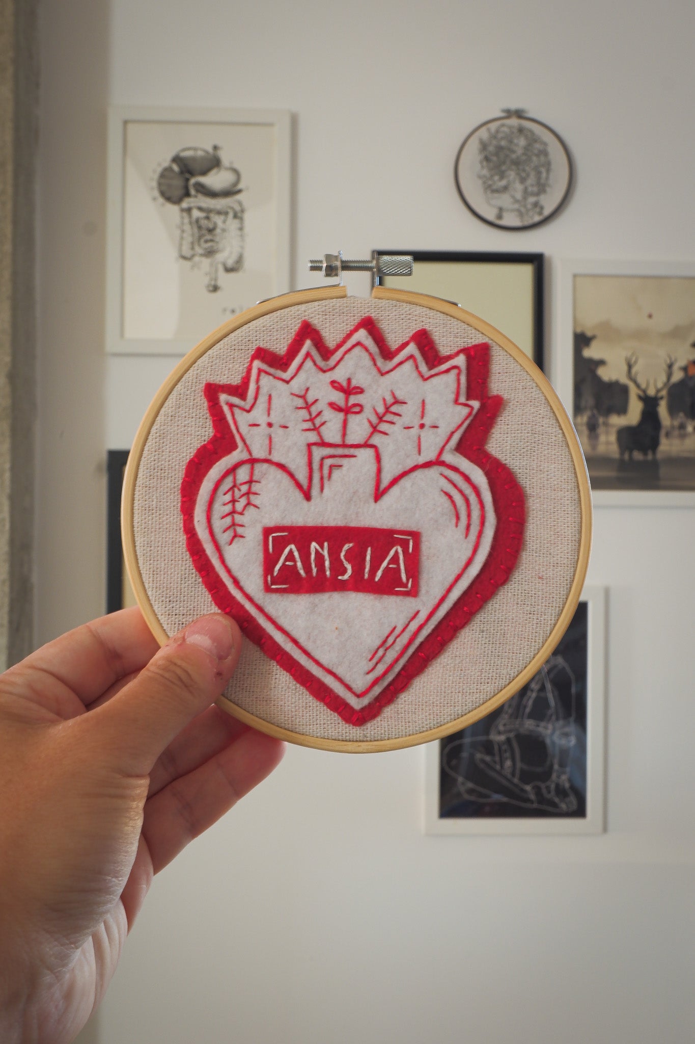 Cuore sacro dedicato all'ansia ricamato a mano su pannolenci e cucita su tela. Montata sul cerchio da ricamo che può essere comodamente appeso direttamente a un chiodo o utilizzando del filo della lunghezza desiderata.