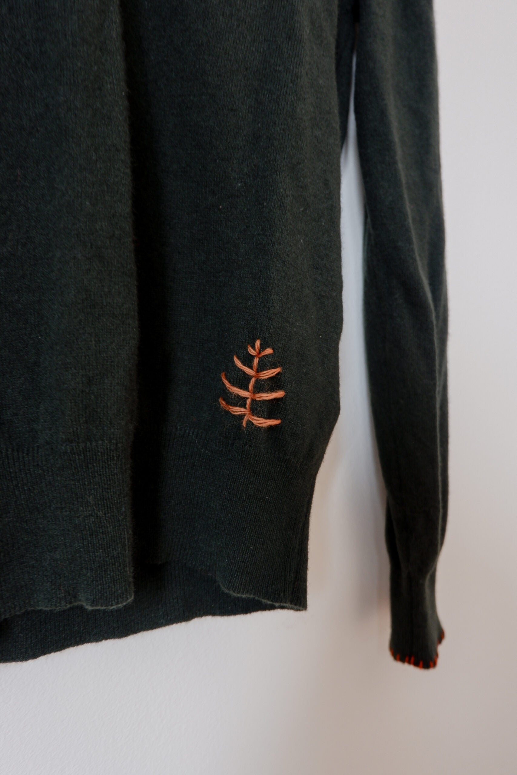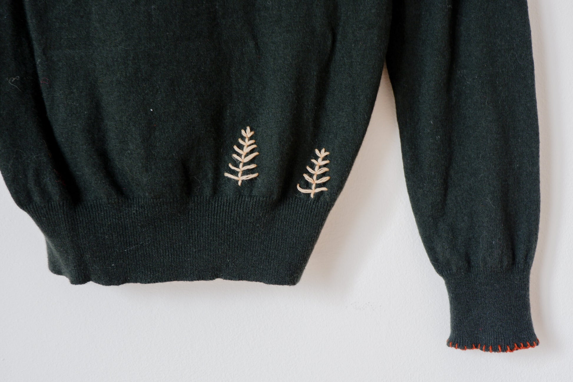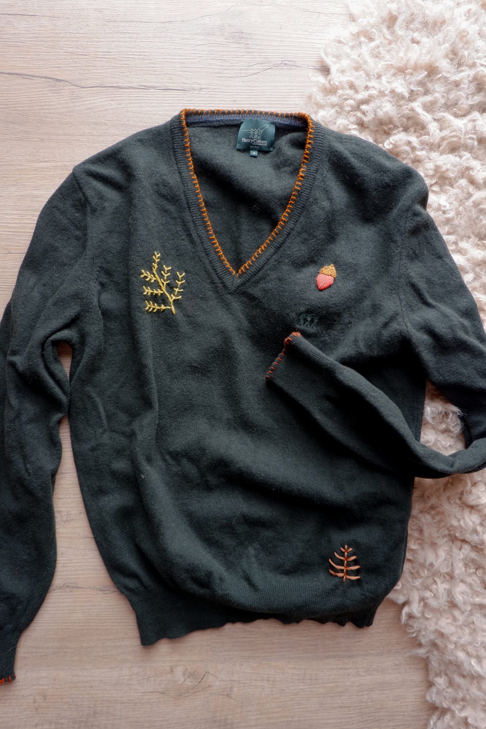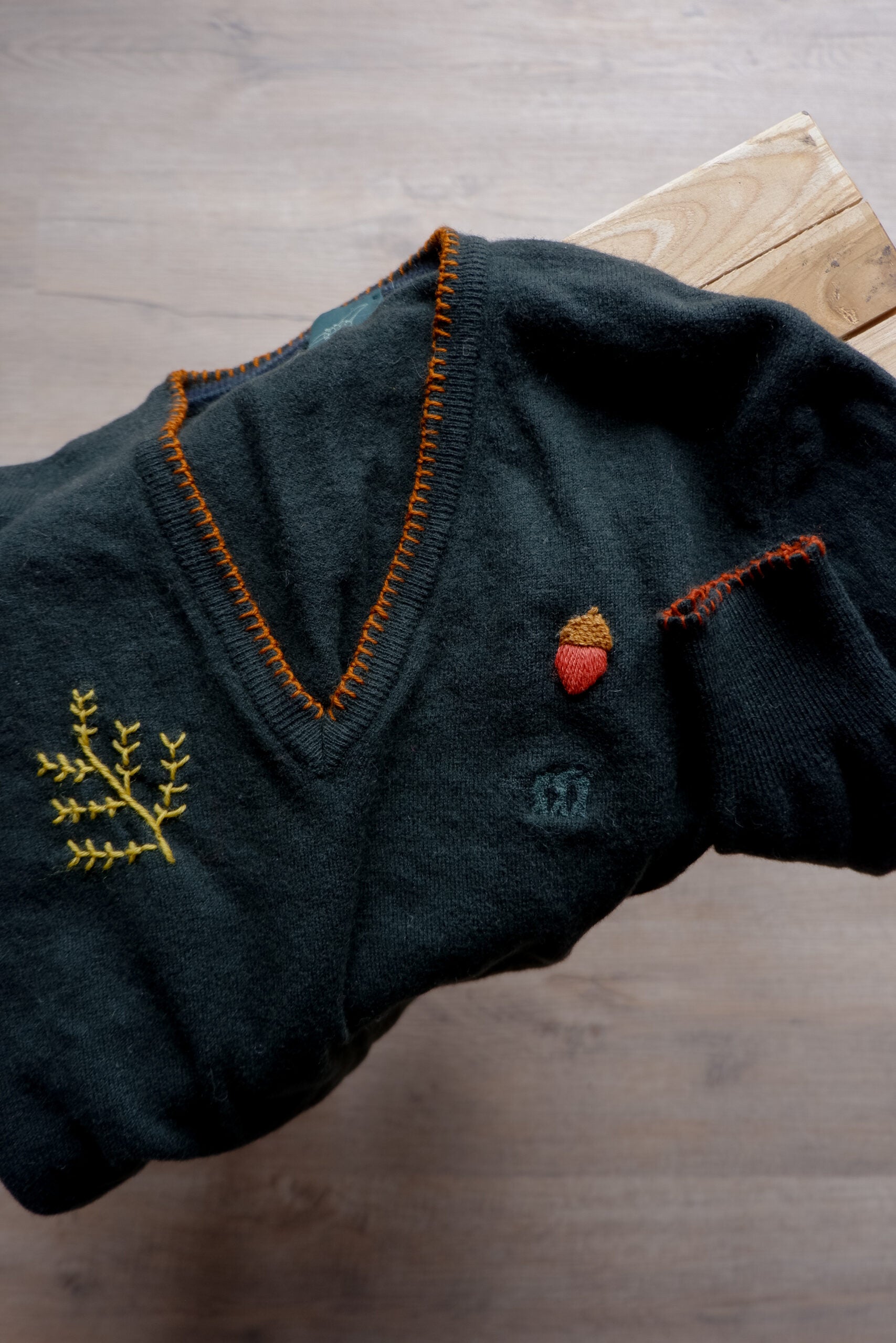 Maglione Foresta fa parte della mia collezione di capi di upcycling, cioè quei capi di seconda mano a cui ho voluto dare una nuova vita con il ricamo.