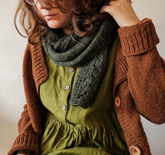 La sciarpa Ginepro è disponibile in due varianti, una per i mesi freddi e una per i mesi più caldi. Entrambe sono realizzate con filati di Purl Soho, Flax Down e Spectrum Silk.