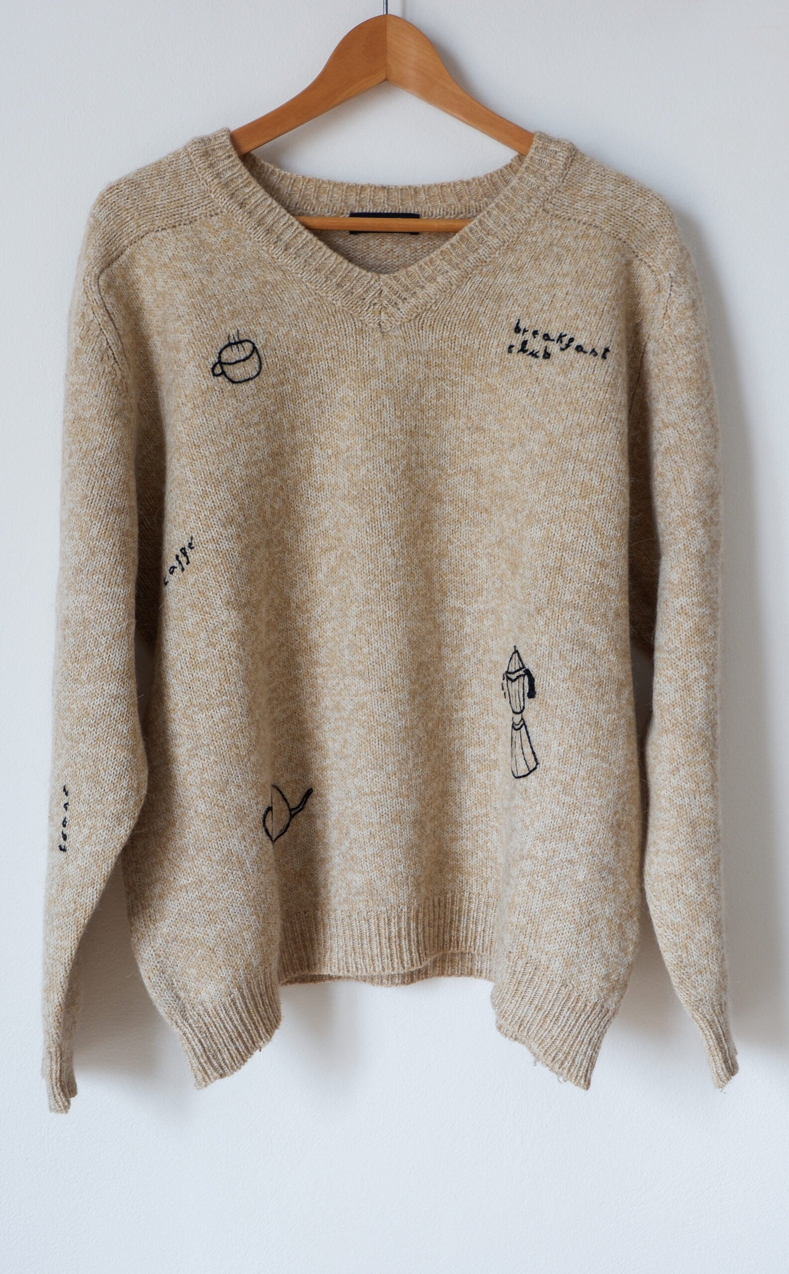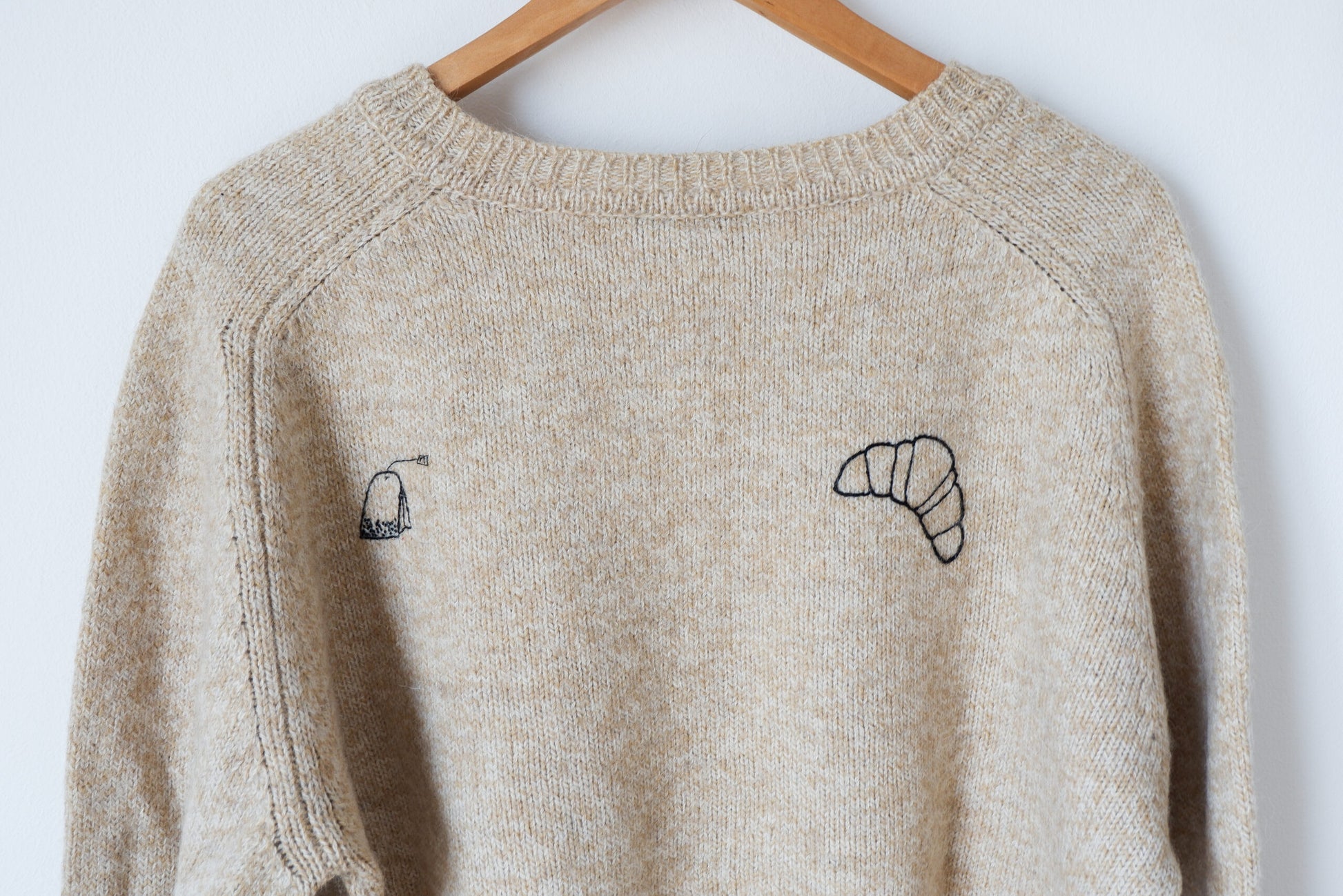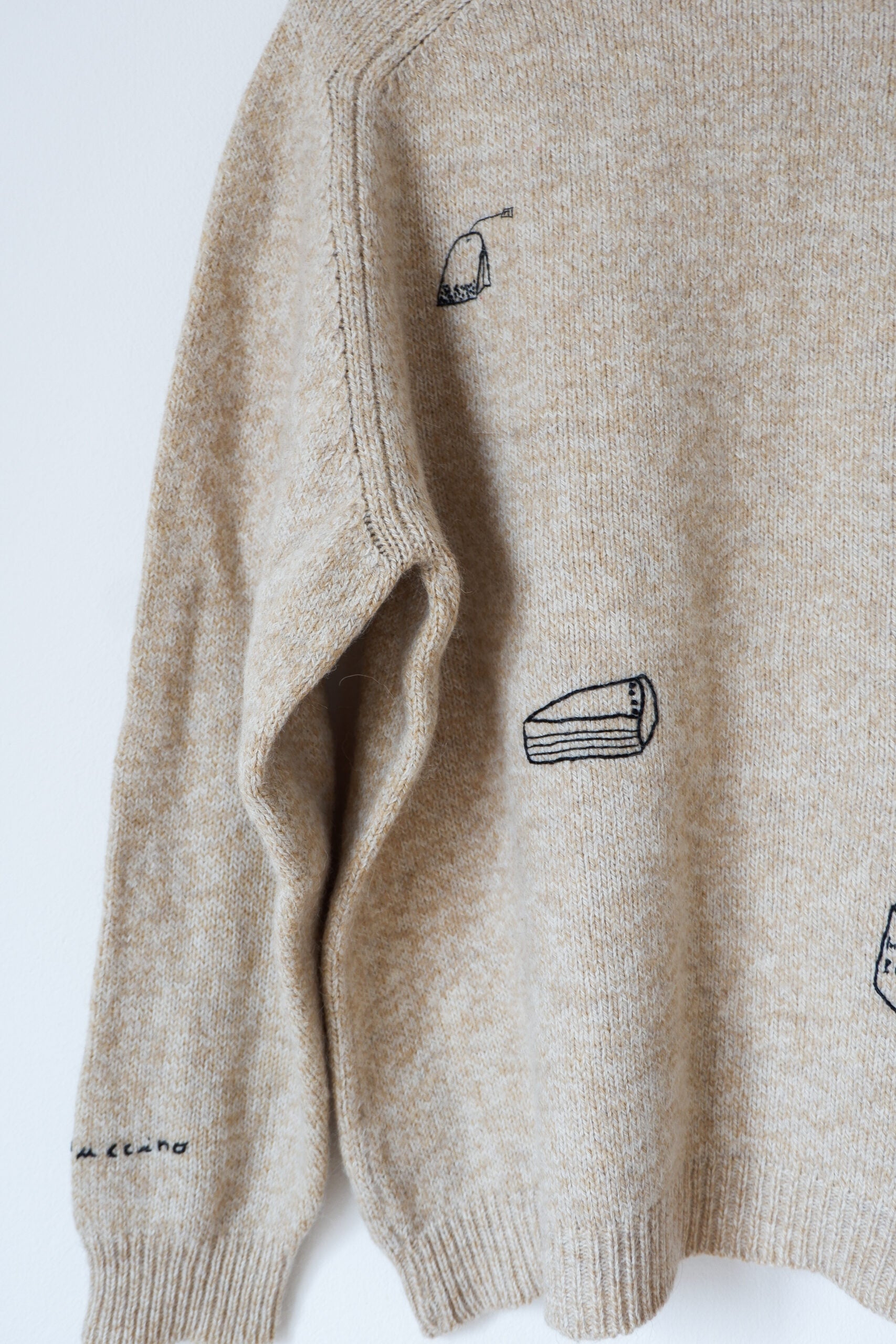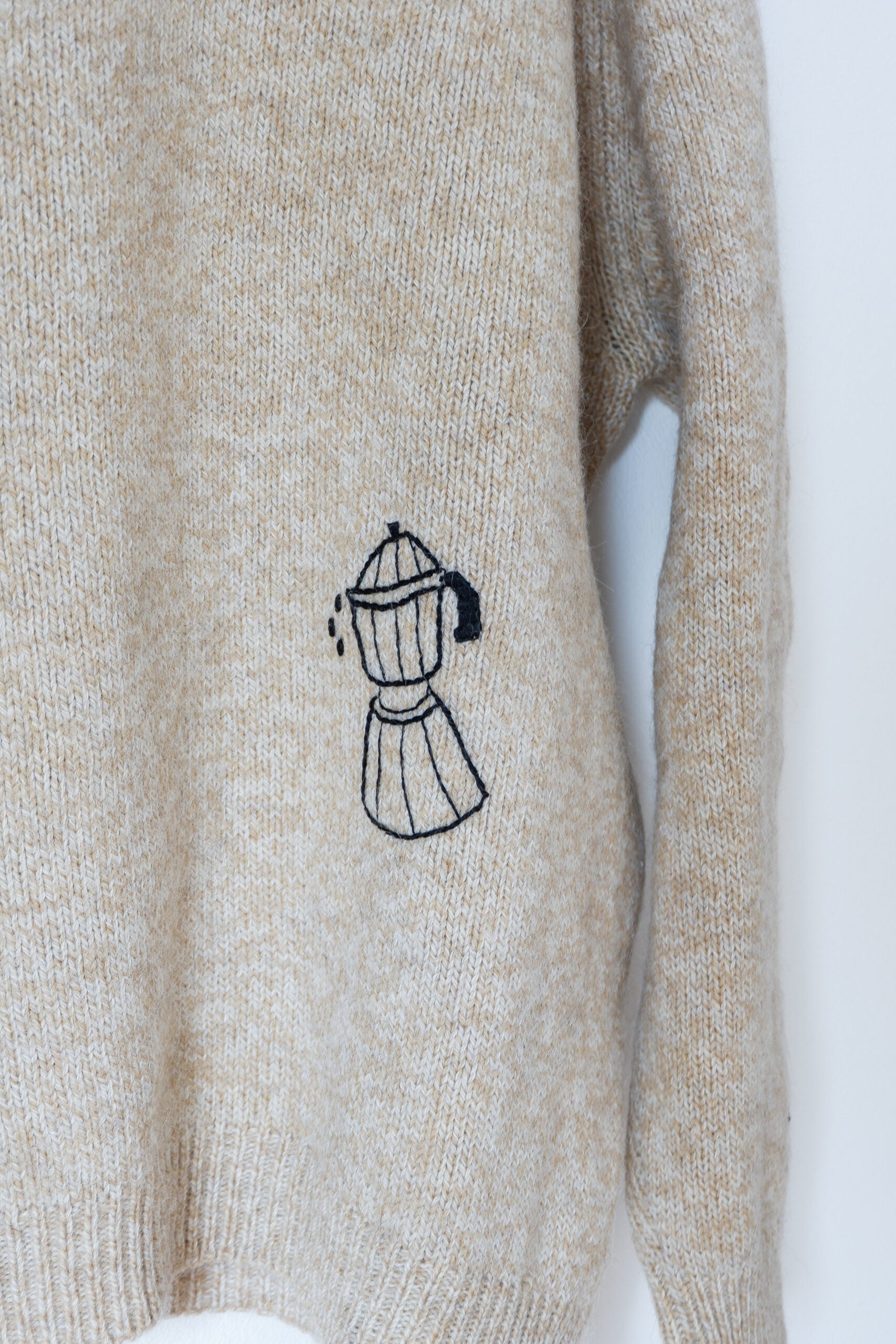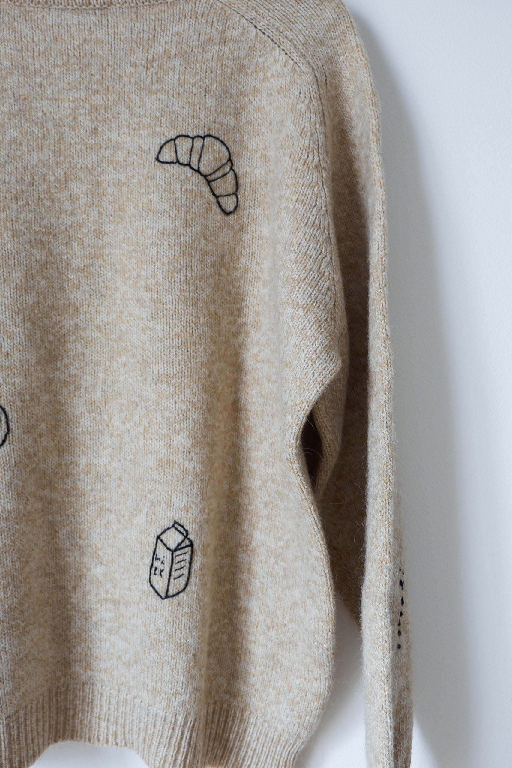 The Breakfast Sweater (il maglione colazione) fa parte della mia collezione di capi di upcycling, cioè quei capi di seconda mano a cui ho voluto dare una nuova vita con il ricamo. I ricami sono di diversi temi e anche i materiali cambiano a seconda del materiale su cui sto lavorando, si va dalla lana al cotone. Ogni capo di questa collezione è unico.