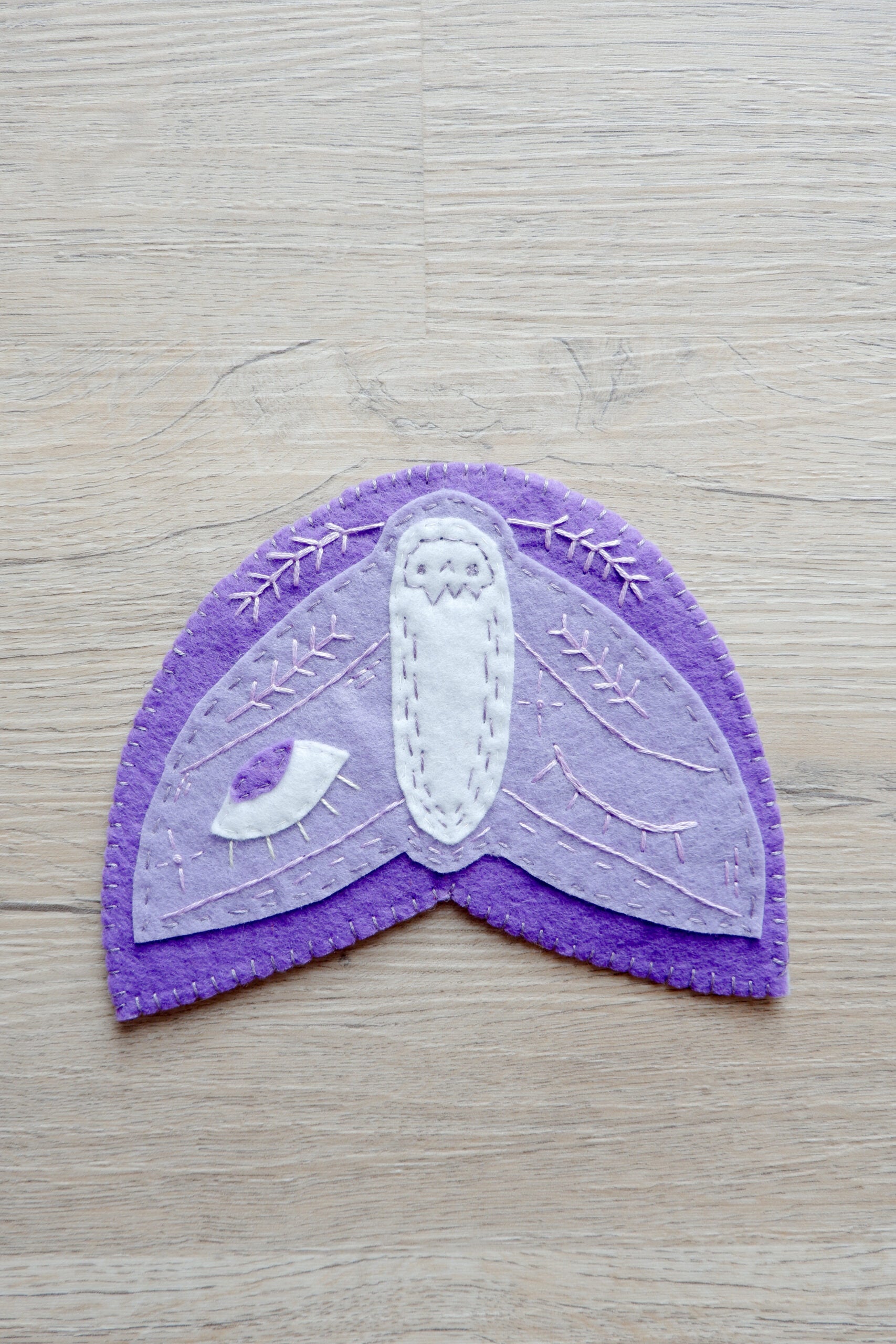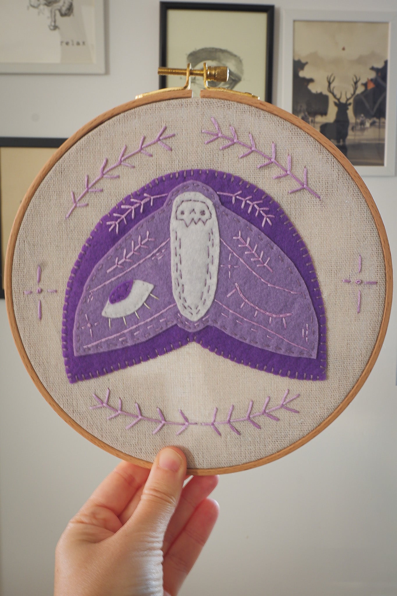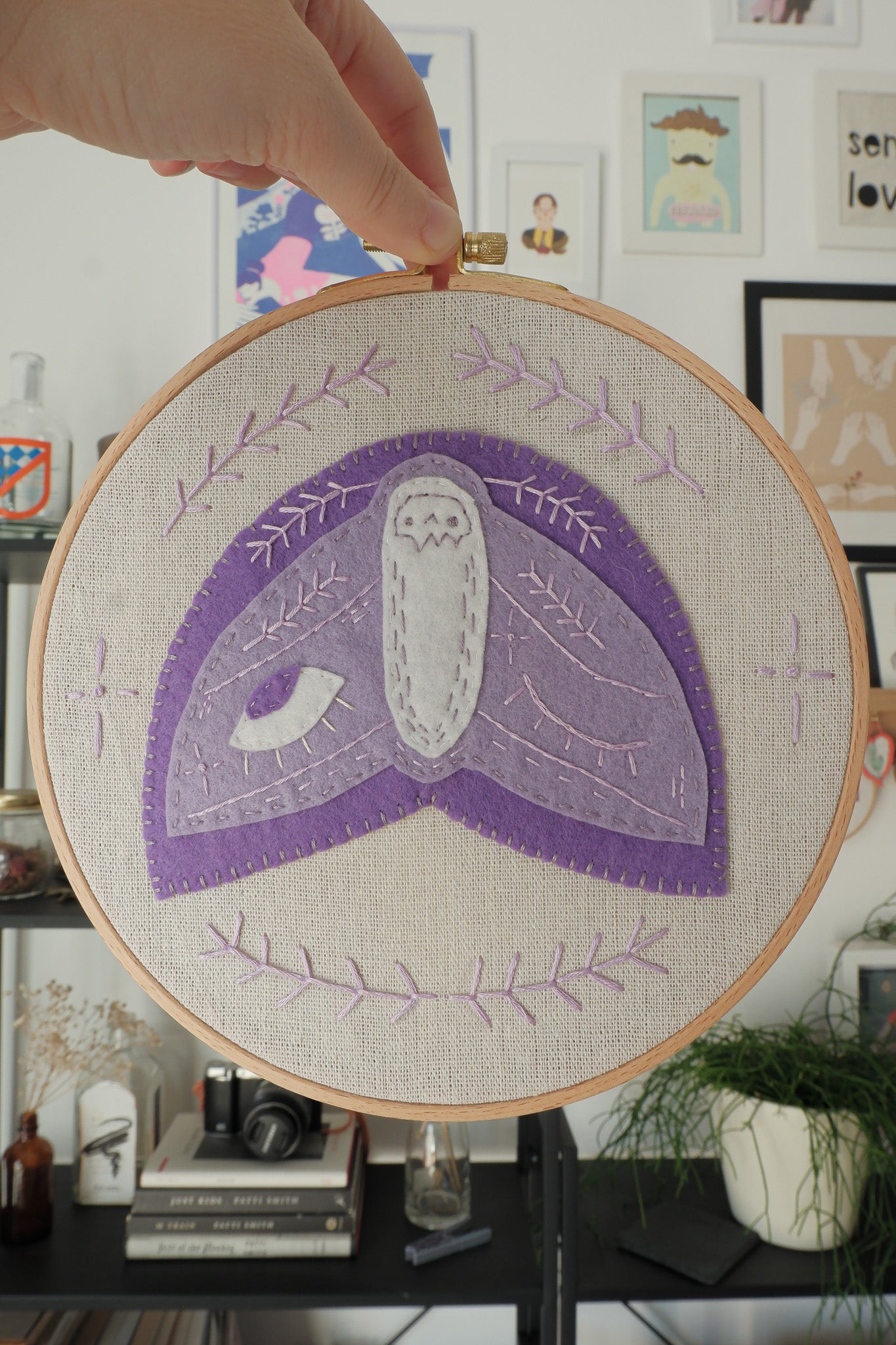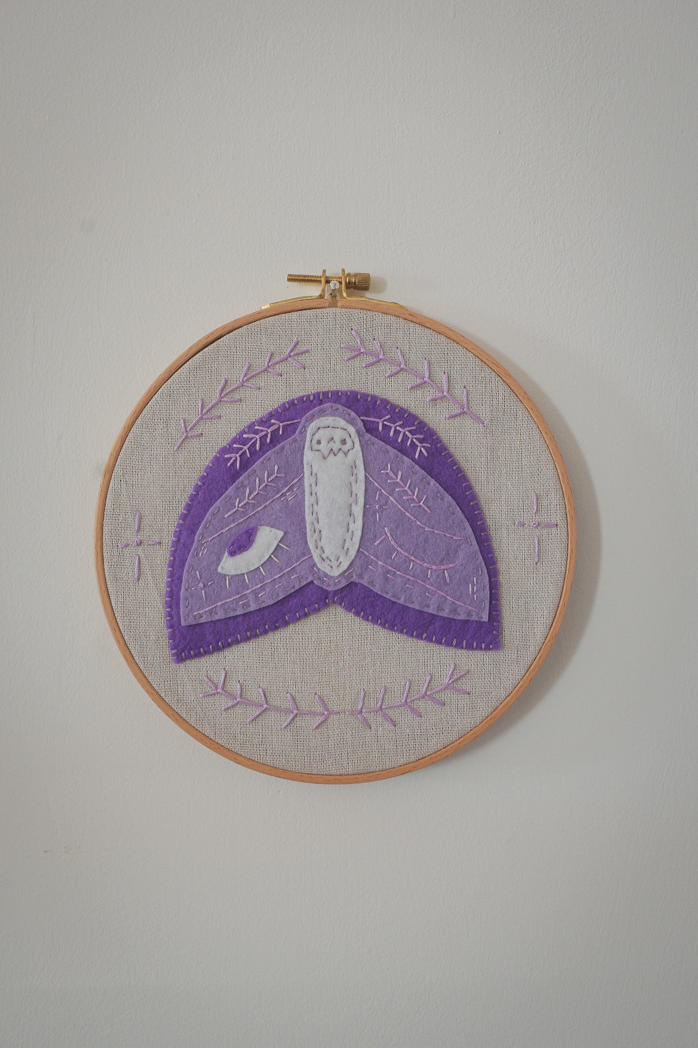 Falena ricamata a mano su pannolenci e cucita su tela. Montata sul cerchio da ricamo che può essere comodamente appeso direttamente a un chiodo o utilizzando del filo della lunghezza desiderata.
